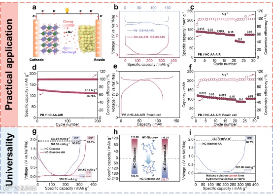图 6. (a) 由 HC-AA-AIR 与普鲁士蓝(PB)组装而成的全电池示意图;(b) HC-AA-AIR 负极与 PB 正极的容量匹配;(c) HC-AA-AIR//PB 全电池的倍率性能;(d) HC-AA-AIR//PB 全电池在1 C倍率下的循环性能;软包电池的电化学性能:(e) 充放电曲线;(f) 倍率性能;通用应用性能:(g) HC-Glucose 与 HC-Glucose-AA 的首次充放电曲线;(h) 首次循环充电曲线中的斜线段容量与平台段容量;(i) HC-Maltitol-AA 的首次充放电曲线。