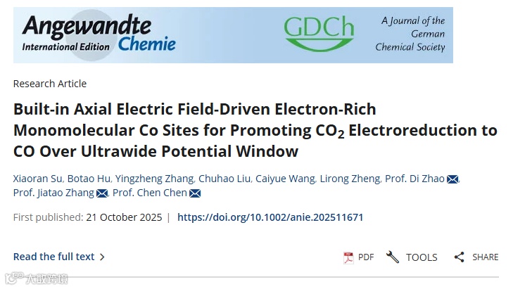北京理工大学赵娣、张加涛,清华大学陈晨在国际知名期刊Angewandte Chemie International Edition发表题为《Built-in Axial Electric Field-Driven Electron-Rich Monomolecular Co Sites for Promoting CO2 Electroreduction to CO Over Ultrawide Potential Window》的研究论文,该论文提出了一种基于内置轴向电场理论的新型不对称单分子Co-N4 位点的催化剂设计策略,同时还提供了一种新的方法来调节平面外极化,以提高催化性能。