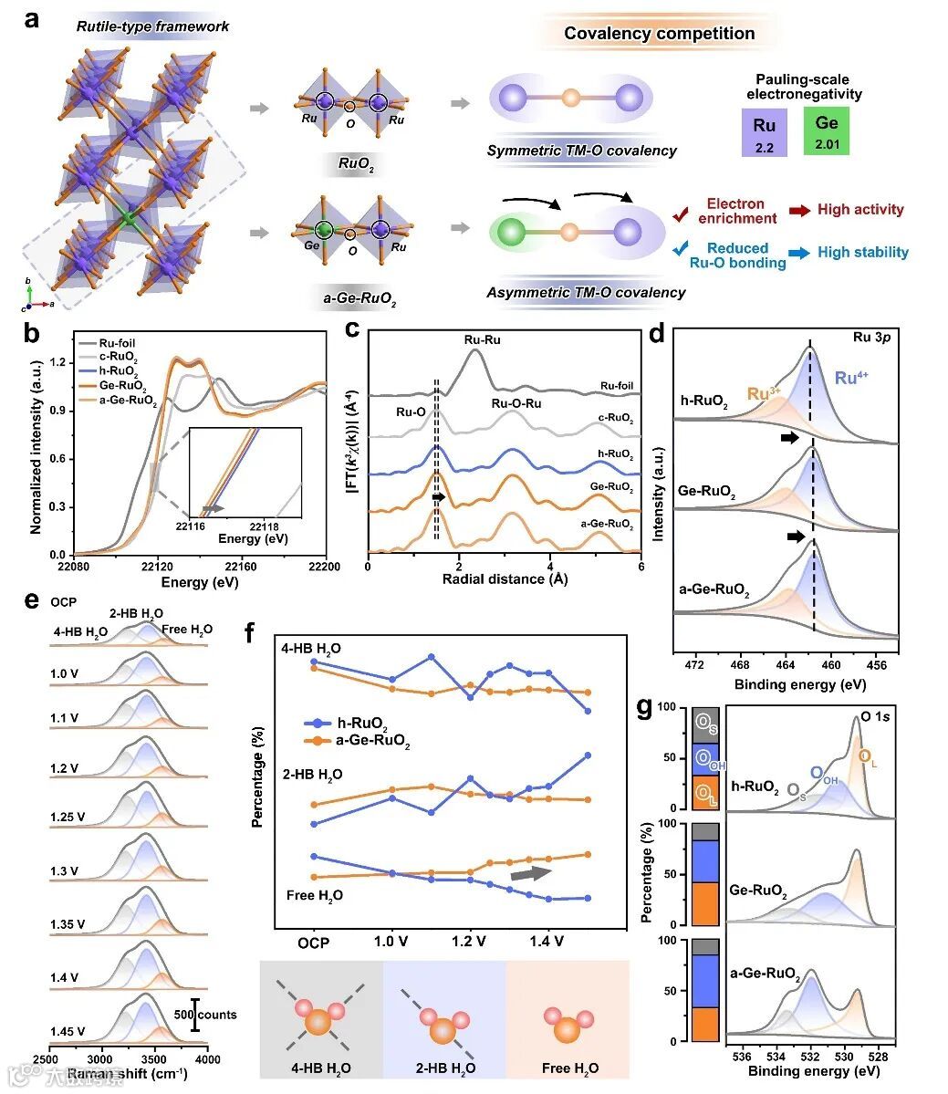 1.a-Ge-RuO2体系通过共价竞争和界面微环境的分工协作工程,实现了催化活性和稳定性的同步优化。具体来说,Ge-O-Ru键网络内的共价竞争诱导了Ru氧化态的降低,削弱了Ru-O共价性,增强了耐腐蚀性。此外,在a-Ge-RuO2上,结构重构产生富集游离水的界面环境,促进了水解离和羟基吸附,加速了OER。