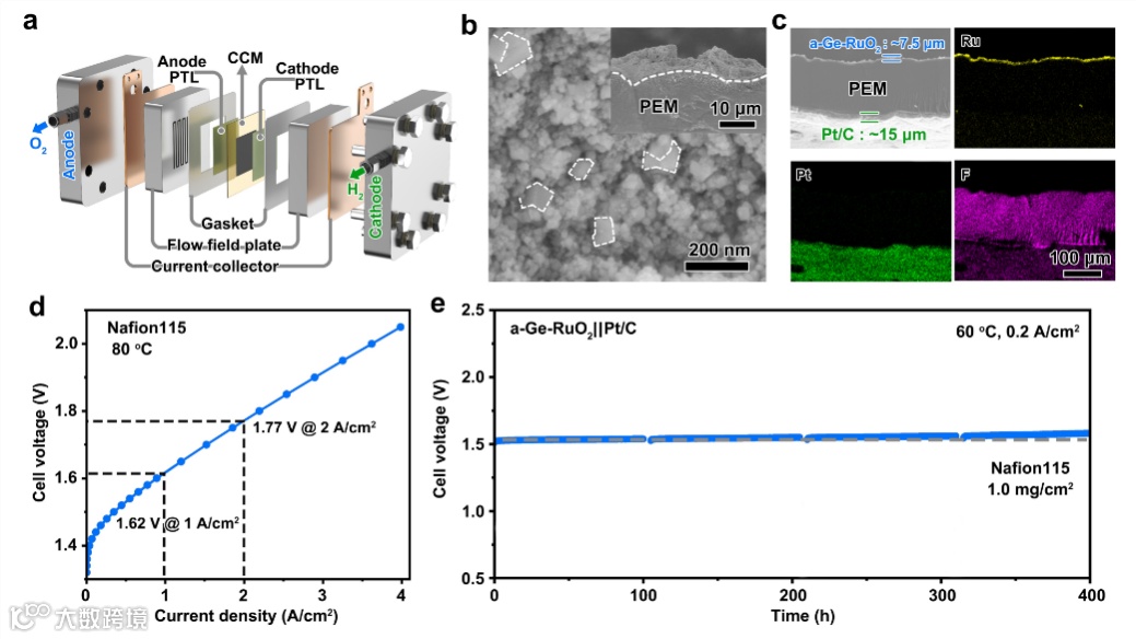 图6. 采用a-Ge-RuO2作为阳极电催化剂的 PEMWE 器件性能。