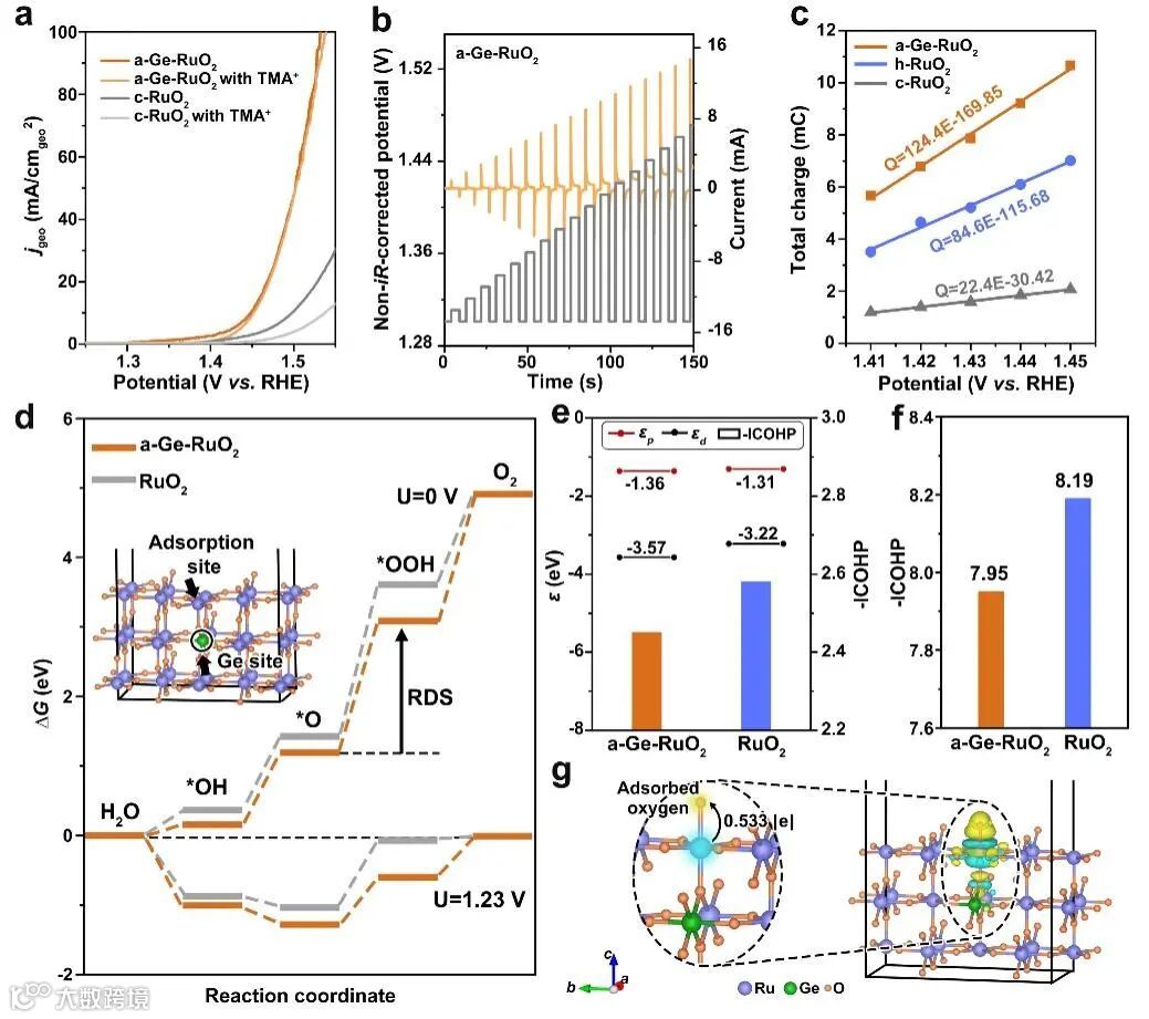 通过理论计算发现a-Ge-RuO2决速步能垒降低,表明Ge-O-Ru网络在增强a-Ge-RuO2的析氧反应活性方面发挥了积极作用;a-Ge-RuO2中的Ru-O*键结合较弱,促进了向OOH*中间体的转化;d带中心的下移减少了反键轨道中的电子填充,削弱了其与反应中间体的结合力,促进了中间体的吸附与脱附,从而有助于提高析氧反应的催化活性。d-p轨道带隙增大,Ru和O之间电子转移减少,Ru-O共价性减弱,抑制晶格氧参与析氧反应,从而提高了长期稳定性。