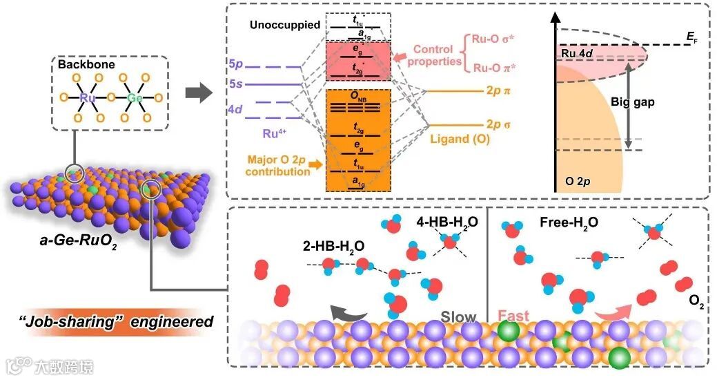 图1. 左图为 a-Ge-RuO2结构示意图,右图为d带中心与p带中心的位移情况及界面水分布图。