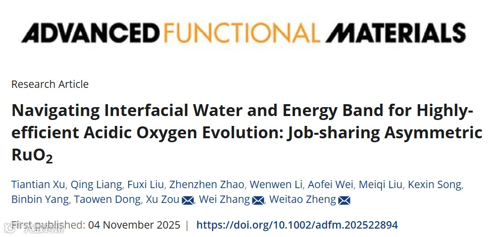 近日,来自吉林大学的邹旭副研究员、张伟教授与郑伟涛教授,在国际知名期刊Advanced Functional Materials上发表题为“Navigating Interfacial Water and Energy Band for Highly-efficient Acidic Oxygen Evolution: Job-sharing Asymmetric RuO2”的研究文章。该研究文章成功制备出价态分离的团簇材料(a-Ge-RuO2)。该材料通过氧析出反应驱动的奥斯特瓦尔德熟化过程,实现了由纳米颗粒向低指数晶面块体的转变。同时,利用重构实现了界面水分子与能带结构的协同作用。Ge-O-Ru基元中的共价竞争促使电子从Ge向Ru转移,降低了Ru的氧化态并抑制晶格氧参与反应,从而有效提高稳定性。与此同时,重构后的界面自由水结构促进了水分解并提升了含氧中间体的吸附能力,显著提升了氧析出反应的动力学性能。