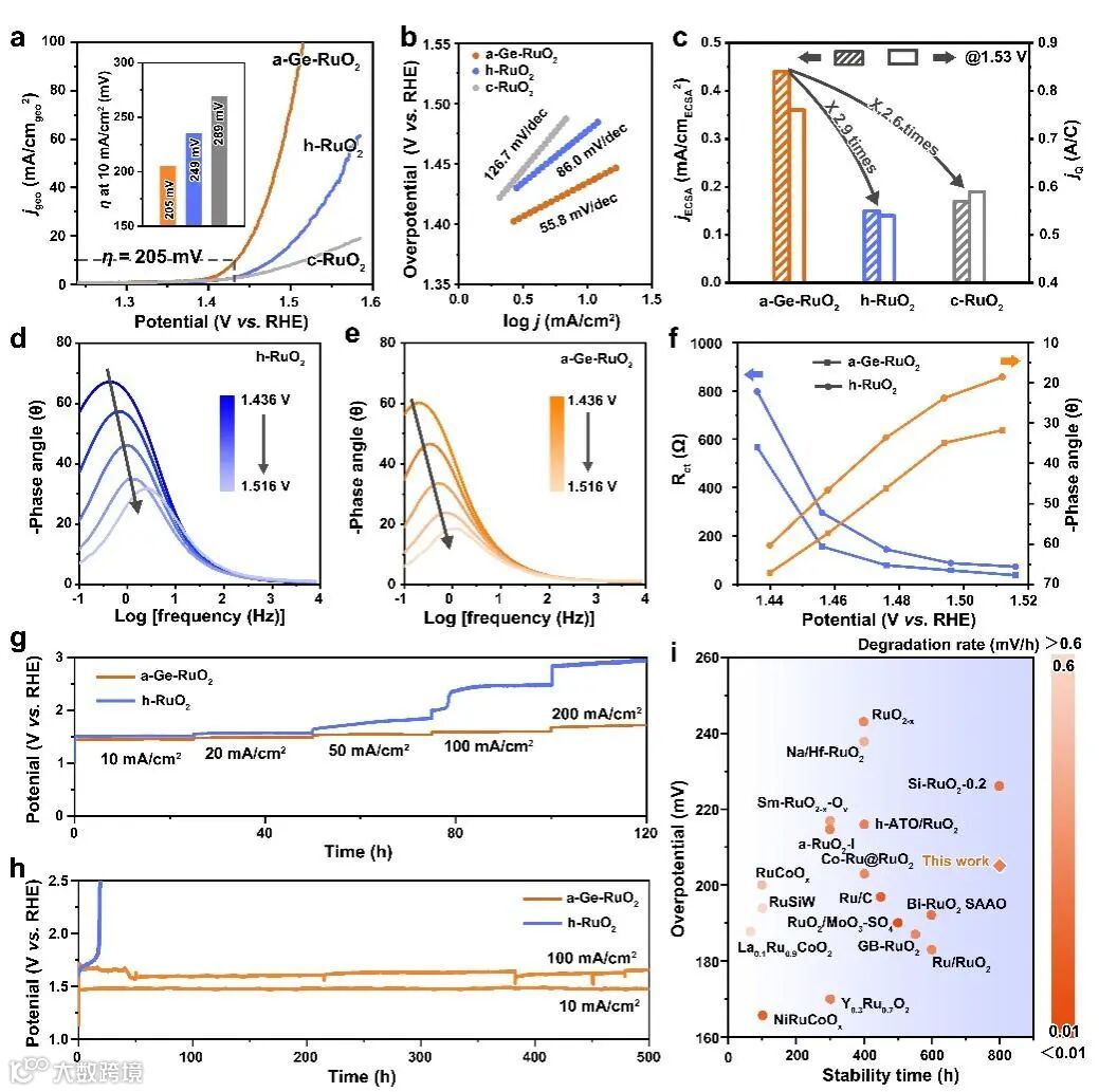 通过电催化重构形成的a-Ge-RuO2在酸性环境中展现出卓越的电催化活性和稳定的性能。在10 mA cm−2时过电位为205 mV,在10 mA cm-2电流密度下可稳定运行超过500小时。在100 mA cm-2的严苛条件下也可稳定运行超过500小时且保持76 μV h-1的极低降解速率。