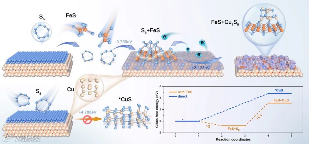 图1. 搁置期间电极上FeS催化S与Cu箔反应过程的示意图