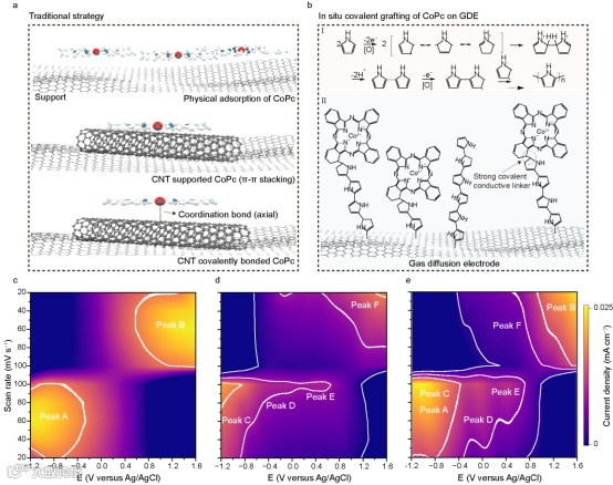 近日,南京大学现代工程与应用科学学院李朝升、冯建勇、邹志刚团队提出一种原位电聚合策略,可将酞菁钴直接共价接枝到气体扩散电极上。通过引入聚吡咯作为连接体,引发气体扩散电极与聚吡咯、聚吡咯与酞菁钴之间的C–C偶联过程,从而将它们连接在一起,使得酞菁钴直接共价接枝到气体扩散电极上。电聚合过程中,吡咯的氧化聚合引发了一系列C–C偶联反应,如同构建了一座分子桥梁,最终通过C–C共价键将催化剂锚定于电极界面。这一策略不仅确保了催化位点的牢固附着与高度分散,更因其避免了复杂的分子修饰与电极预处理,保持了电极的疏水特性,从而为CO2气体的高效传质创造了条件。电化学分析表明,所得复合电极在保留酞菁钴本征氧化还原特征的同时,其峰电位发生显著负移且电流响应大幅增强,初步揭示了聚吡咯与酞菁钴之间存在电子相互作用。