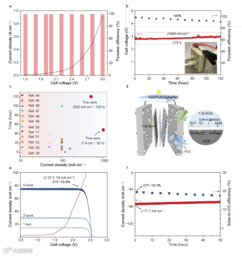 为推动该技术走向可持续能源应用,我们将上述电解池与三结太阳能电池集成,组装了一种无偏压、太阳能驱动的CO2还原系统。为匹配太阳能电池与电解池的最大输出功率,逐步调整了光照强度。在相当于5倍标准太阳光强下,实现了19.2%的太阳能到CO转化效率,且电解池的工作电压与电流与太阳能电池的最大输出功率点接近。在5倍光强下,该太阳能驱动系统能够进行CO2还原长达50小时,展示了基于共价接枝策略所制备的CoPc/ppy/GDE电极在实际复合能源系统中的有效性,为利用可再生电力生产燃料提供了有前景的技术方案。