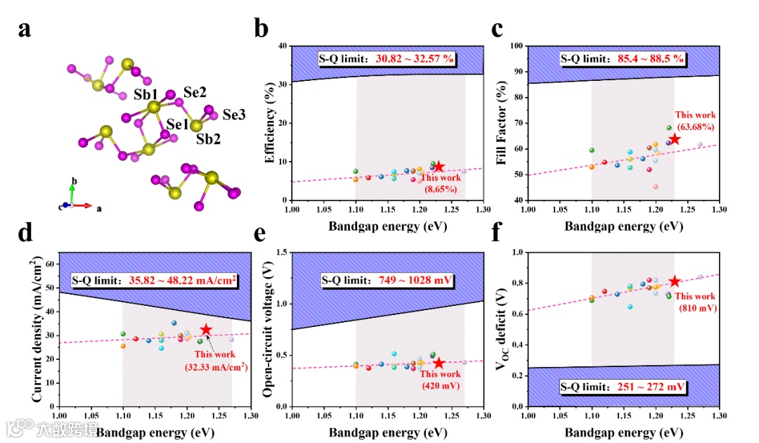 Figure 7. (a) Crystal structure of orthorhombic Sb2Se3; Summary of the performance of VTD derived Sb2Se3TFSCs: (b) PCE; (c) VOC; (d) FF; (e) JSC; (f) VOC deficit. The orange dotted line indicates the trend of performance development.