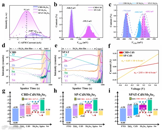 Figure 3. (a) Statistics of tunnelling current of different Sb2Se3 thin films; Discrete frequency chart of frequencies versus potential of different (b) CdS and (c) Sb2Se3 thin films; Secondary ion mass spectrometry (SIMS) profiles of (d) CBD-TFSC and (e) SPAT-TFSC; (f) Current-voltage (I-V) plot of devices based on CBD- and SP-CdS films; Schematic diagram of the bandgap alignment of (g) CBD-TFSC, (h) SP-TFSC and (i) SPAT-TFSC.