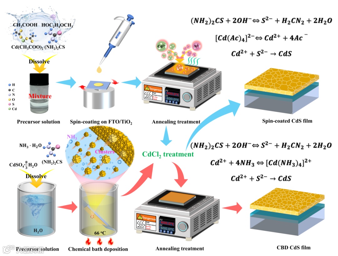 近年来,硒化锑(Sb2Se3)作为一种新兴的绿色薄膜光伏材料,凭借其原材料储量丰富、合适的光学带隙(~1.17 eV)、极高的吸光系数(>105 cm-1)以及独特的准一维晶体结构,展现出巨大的应用潜力。然而,尽管其光电转换效率已取得显著进展,但相较其理论极限仍存在较大差距。究其原因,不佳的电子传输层(ETL)质量及其引发的异质结界面能带失配、载流子输运阻碍以及非理想吸收层生长取向等系列问题是限制其性能进一步提升的关键问题。特别是对于采用气相传输沉积(VTD)等真空法制备的顶衬结构Sb2Se3器件,ETL的质量直接决定了吸收层形核过程与生长取向。目前主流的化学水浴沉积(CBD)法制备的硫化镉(CdS)缓冲层虽工艺成熟,但其面临的“团簇堆积”生长过程容易导致薄膜表面粗糙,不仅会阻碍Sb2Se3薄膜的垂直取向择优生长,还易在异质结处形成高密度的深能级缺陷(如VSe等),加剧Sb2Se3器件的非辐射复合损失,从而限制开路电压(VOC)和填充因子(FF)的提升。此外,传统CBD沉积工艺伴随大量含镉废液的产生,与光伏产业的绿色发展理念相悖。相比之下,旋涂法(Spin-coating)基于“离子逐层”生长机制,具有工艺简便、成本低廉、组分可控且环境友好等显著优势,能够制备出表面平整且无高表面电势团簇的薄膜。尽管此前基于旋涂CdS衬底的Sb2Se3电池得到了相关研究,但光电转换效率多停留在6%以下,这表明旋涂CdS薄膜的成膜及界面质量仍需得到进一步的提升。因此,开发更为有效的方法来提升CdS薄膜的质量,从而协同增强Sb2Se3薄膜太阳能电池的异质结性能匹配、垂直生长取向和载流子传输,这对Sb2Se3薄膜太阳能电池性能提升与发展至关重要。