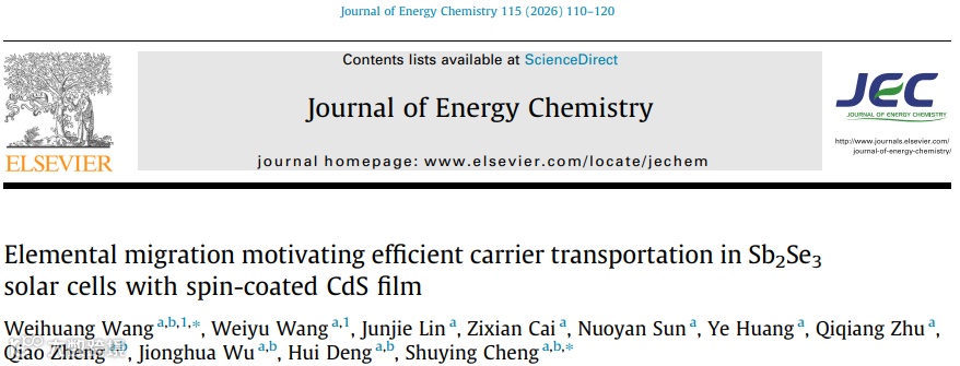 近日,来自福州大学的王伟煌副研究员、程树英教授团队,在国际知名期刊Journal of Energy Chemistry上发表题为“Elemental Migration Motivating Efficient Carrier Transportation in Sb2Se3 Solar Cells with Spin-Coated CdS Film”的研究论文。该研究针对目前限制真空法制备Sb2Se3太阳电池效率的关键——电子传输层(ETL)质量问题,提出了一种基于旋涂法(Spin-coating)CdS薄膜的替代策略,将基于旋涂CdS衬底Sb2Se3太阳电池的效率提升至8.65%。