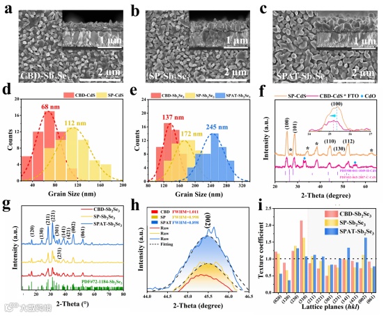 Fig. 2 SEM images of (a) CBD-Sb2Se3, (b) SP-Sb2Se3, and (c) SPAT-Sb2Se3samples; grain size distributions of (d) CdS films and (e) relevant Sb2Se3films; XRD patterns of (f) CdS films and (g) Sb2Se3 films; (h) texture coefficients for different Sb2Se3 crystal planes; (i) enlarged (002) diffraction peak of Sb2Se3 films.
