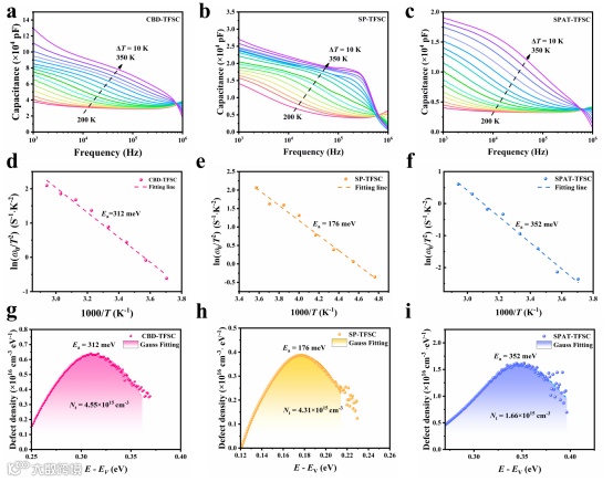Figure 6. Temperature-dependent admittance results for CBD-TFSC/SP-TFSC/SPAT-TFSC device. a/b/c) Capacitance−frequency−temperature (C−f−T) spectra, d/e/f) Arrhenius plots of ln(ω0/T2) versus 1000/T and g/h/i) Defect densities.