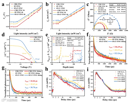Figure 4. Photoelectric and electrochemical characterizations of CBD-TFSC, SP-TFSC and SPAT-TFSC devices: (a) Light intensity dependent curves for VOC and (b) JSC; (c) Nyquist EIS curve; (d) 1/C2 -V plots; (e) C-V and DLCP curves; (f) TPV and (g) TPC decay curves; Transient decay kinetics (scatter) monitored at 560 nm (h) and 680 nm (i) for Sb2Se3thin films (the fitted curves are solid).