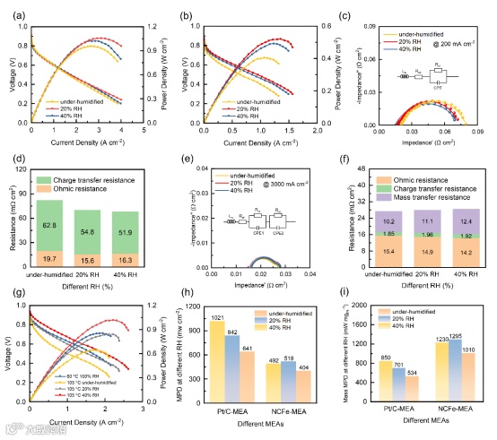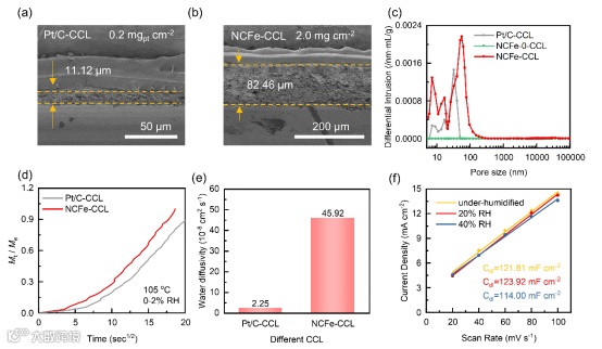 催化层断面与压汞法测试分析表明NCFe-CCL相对于商业铂碳催化剂形成的催化层拥有较厚的催化层与更大的孔体积,进而在VTI-SA测试中,NCFe-CCL展现出优秀的水保持能力。在105℃电池温度,200 kPa背压且阴极进气相对湿度仅为20%的工况下,电池的峰值功率密度在氢氧条件下依旧达到了1057 mW cm-2,氢空条件下达到了518 mW cm-2。