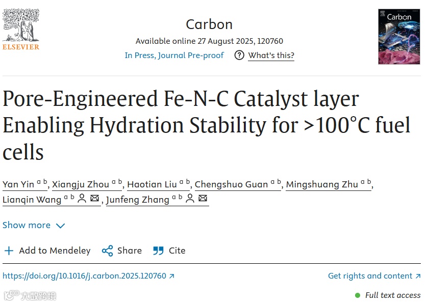 近日,来自天津大学的尹燕教授、张俊锋副教授、王连芹助理研究员等,在国际知名期刊Carbon上发表题为“Pore-Engineered Fe-N-C Catalyst layer Enabling Hydration Stability for >100°C fuel cells”的观点文章。该观点文章针对中温燃料电池催化层水分快速流失的问题,设计出了一款具有高保湿性的Fe-N-C阴极催化层,保证了燃料电池在大于100℃条件下的稳定运行。