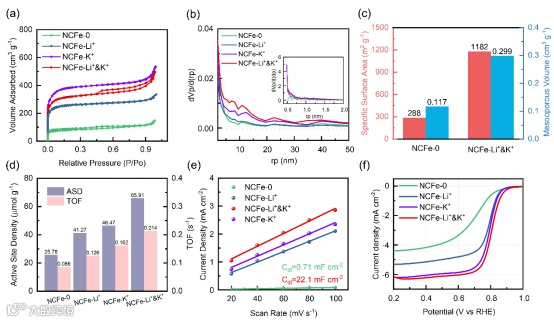利用金属盐对催化剂在高温下进行刻蚀,显著提升了催化剂的石墨化程度,促进了催化剂导电性、耐腐蚀性的提升。此外,BET测试与亚硝酸盐溶出伏安法测试表明催化剂比表面积和介孔体积的提升,使NCFe-Li+&K+的有效活性位密度提升了2.5倍(65.91 μmol g-1),铁原子利用率提升至30.76%。最终,在三电极测试体系中,NCFe-Li+&K+展现出优秀的电化学性能(22.1 mF cm-2和0.812 V vs RHE)。