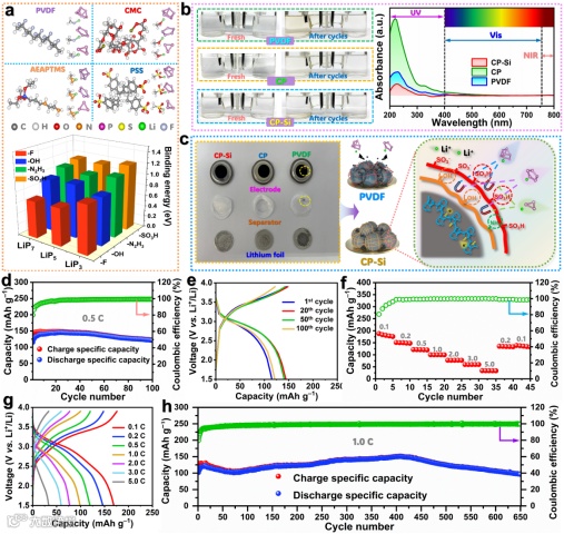 图5(a)显示了通过密度泛函理论计算的新型多功能导电粘结剂中典型官能团与多磷化锂(LiP₃、LiP₅和LiP₇)的结合能。这些高结合能表明其具有强锚定能力,可有效抑制多磷化锂穿梭效应。图5(b)显示了用该粘结剂制备成黑磷负极所组装的H型电池直观观察黑磷负极的溶解行为,表明多磷化锂从黑磷基负极中大量溶出。尽管因多磷化锂组分复杂该结果仅反映相对趋势,但显著降低的数值证明了BP/G@CP-Si负极增强的多磷化锂吸附能力。图5(c)所示的循环后拆解半电池的分析结果显示,使用CP-Si粘结剂的电池锂电极表面仅见微量黑色沉积物,而PVDF粘结剂体系的锂电极则出现大面积黑色沉积。表明CP-Si粘结剂凭借其坚固复合结构与黑磷颗粒形成强粘附,其多重极性基团不仅确保浆料制备过程中的有效结合,还通过偶极-偶极相互作用锚定黑磷负极产生的可溶性多磷化锂。这种双重作用显著缓解黑磷损耗与电极降解,从而提升黑磷基负极的电化学循环稳定性。