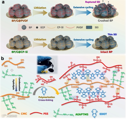 过去二十年间,锂离子电池的商业化彻底改变了能源市场格局。其高能量密度和长循环寿命有力推动了便携式电子设备与电动汽车的迅猛发展和广泛应用。然而,具有高理论容量的新一代电极材料在实现商业化前仍面临严峻挑战。磷黑作为一种具有高体积导电率和低密度的层状二维材料在锂离子电池负极材料的应用研究近年来受到广泛关注,尤其是其特殊褶皱结构为锂离子传输提供了超快扩散通道,其理论容量高达2596 mA h g−1,彰显其作为锂电负极的巨大潜力。然而,磷黑电极材料却存在致命缺陷:在锂化/脱锂过程中会产生超过300%的极端体积膨胀,这种剧烈的体积变化会导致电极粉化及容量快速衰减。此外,更本质的问题是磷黑负极的储锂机制与硫正极类似,涉及转化型反应——P−P键断裂会生成可溶性多磷化锂中间体(LixPs)。这些中间体与电解液溶剂强烈作用,导致溶解和穿梭效应,引发活性物质不可逆损耗和对电极腐蚀等严重问题。为解决这些难题,前人研究主要聚焦于通过定制化制备方法与多种碳基质(如石墨、碳纳米管、导电炭黑)构建磷-碳复合材料。抑制多磷化锂穿梭效应的策略依赖于物理限域和化学吸附,例如采用锂离子导电共价有机框架纳米片修饰隔膜,或构建LiF化学吸附层。这些方法虽有效,但合成复杂且成本高昂,因此,开发先进功能性粘结剂成为稳定黑磷负极的新途径。