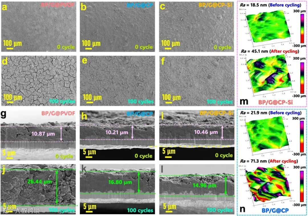 图4(a–c)显示了充放电循环初始阶段三种黑磷负极表面的SEM照片,其均呈现平整致密的表面形貌。图4(d–f)显示了经过100次充放电循环后三种黑磷负极表面的SEM照片,此刻出现了显著的形态差异。BP/G@PVDF负极表面出现严重裂纹;BP/G@CP负极仅显示轻微裂纹;而BP/G@CP-Si负极则保持完好的结构完整性,未观察到微观裂纹。图4(g–i)所示的截面SEM分析显示:BP/G@CP-Si的初始电极厚度为10.46 μm、BP/G@CP为10.21 μm、BP/G@PVDF为10.87 μm。图4(j–l)显示循环后的体积膨胀率数据为:BP/G@PVDF负极143.2%、BP/G@CP负极64.5%,而BP/G@CP-Si负极仅43.0%。这些结果证明CP-Si粘结剂具有缓解内应力、增强黑磷基负极结构稳定性的卓越能力。图4(m,n)所示的循环过程中电极表面粗糙度AFM参数演变显示:经过100次循环后,BP/G@CP负极粗糙度显著增加至71.3 nm,表明存在不受控的膨胀,而BP/G@CP-Si负极仅适度增加至45.1 nm。这种显著差异突显了CP-Si粘结剂在抑制体积膨胀方面的有效性,印证了CP-Si粘结剂的应力消散能力,这正是CP-Si粘结剂制备的黑磷负极获得长循环寿命的关键因素。