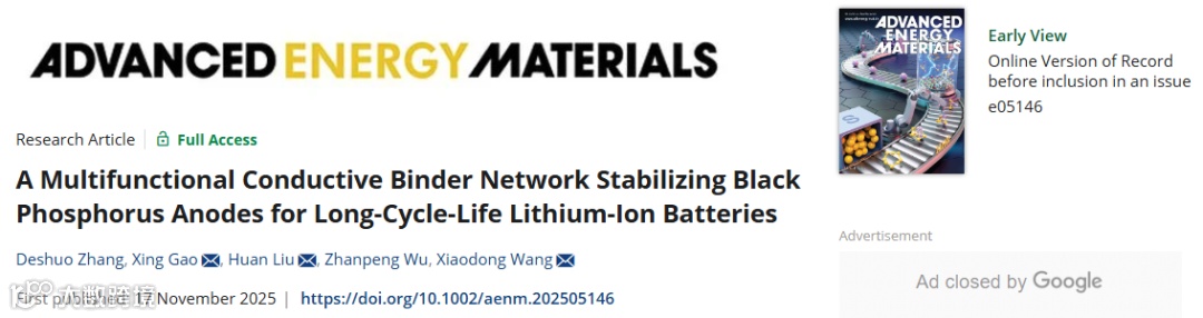 近日,北京化工大学材料学院汪晓东教授、刘欢副教授团队报道了一种可稳定黑磷负极的多功能导电粘结剂网络来实现锂离子电池长循环寿命。该研究成果以“A Multifunctional Conductive Binder Network Stabilizing Black Phosphorus Anodes for Long-Cycle-Life Lithium-Ion Batteries”为题发表在国际知名学术期刊《Advanced Energy Materials》(IF=26)。论文的第一作者为北京化工大学材料科学与工程学院硕士生张德硕,通讯作者为汪晓东教授、刘欢副教授和高兴博士。该课题得到了北京市自然科学基金的资助。