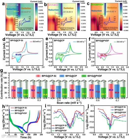图3(a–c)显示了基于循环伏安法(CV)和恒电流间歇滴定技术(GITT)所测得到电化学行为。在第三周循环中,BP/G@CP-Si负极的氧化还原峰电位差(ΔV)为0.47 V,显著小于BP/G@CP(0.56 V)和BP/G@PVDF(0.65 V)负极。这种更小的极化现象表明CP-Si粘结剂有效改善了充放电动力学。图3(d–g)对比了各电极的电容贡献占比:在所有扫描速率下,BP/G@CP-Si负极均展现出最高的电容贡献率,这归因于CP-Si粘结剂提供的高导电性和紧密包覆结构。图4(h)展示了三种电极在锂化/脱锂过程中的典型电压弛豫曲线,每个电流脉冲后弛豫期间的电压变化反映了相应反应步骤的过电位。图(4i,j)显示了基于菲克第二定律计算的DLi⁺值,结果表明BP/G@CP-Si负极在充放电过程中的DLi⁺值均显著高于另外两种负极,证实了其改善的锂离子扩散动力学。这种增强效应源于CP-Si动态交联网络在循环过程中实现的有效应力消散与持续结构完整性,从而维持了高效离子传输路径。