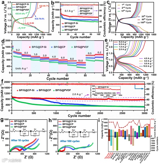 为评估CP-Si作为三维导电聚合物粘结剂的电化学性能,将其与最广泛使用的商业粘结剂PVDF及对照样品(CP)进行对比研究。图2(a)显示了黑磷负极在半电池中以0.01–2.50 V电压窗口进行恒电流充放电测试。所基于CP-Si所制备的黑磷负极(BP/G@CP-Si)展现出80.7%的优异初始库伦效率,优于商业粘结剂和简单混合所制备的黑磷负极。初始容量损失主要源于固体电解质界面膜的形成,首周循环伏安曲线佐证了这一过程,表明坚固钝化SEI膜的形成,能有效抑制持续不可逆副反应。此外,其较低极化电压表明CP-Si粘结剂促进了更有效的活性物质利用。图2(b,c)显示BP/G@CP-Si负极在0.1 A g−1电流密度下展现出卓越的循环稳定性。循环100周后仍保持1014.2 mAh g−1的高可逆容量,相当于第2至100周容量保持率达80.5%。图2(d,e)显示了BP/G@CP-Si负极卓越的倍率性能。图3(f)显示了BP/G@CP-Si经3000次循环后仍保持741.0 mAh g−1可逆容量,容量保持率达76.1%,且第1000至3000周间保持率高达90.0%,展示了优异的长循环稳定性。图2(g,h)显示BP/G@CP-Si负极的电荷转移电阻在多循环后不断下降,而对比参照的负极材料 却不断上升。BP/G@CP-Si负极的初始下降归因于导电固体电解质界面膜(SEI)的形成,而其他电极后续观察到的阻抗上升则表明循环过程中体积变化导致的结构降解。表明CP-Si粘结剂通过增强导电性、有效消散体积变化应力、促进电荷均匀分布及加速锂离子传输,共同确保高容量保持率。
