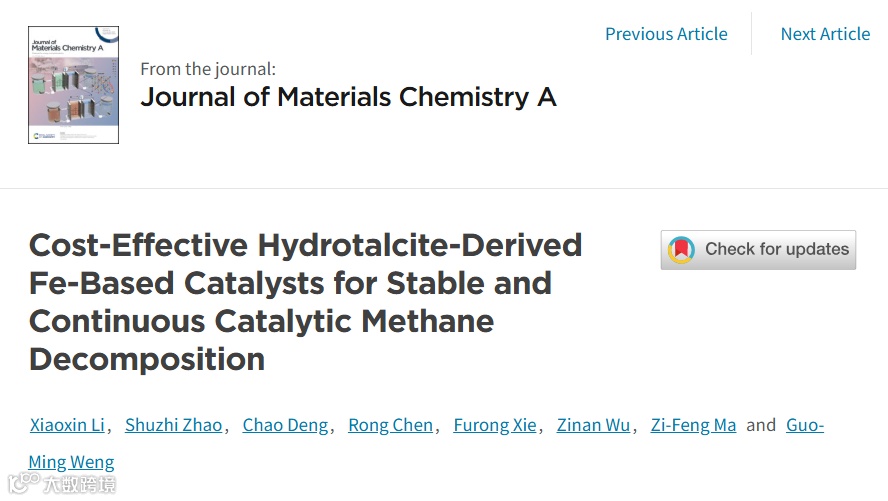 Xiaoxin Li , Shuzhi Zhao , Chao Deng , Rong Chen , Furong Xie , Zinan Wu , Zi-Feng Ma and Guo-Ming Weng. Cost-Effective Hydrotalcite-Derived Fe-Based Catalysts for Stable and Continuous Catalytic Methane Decomposition. Journal of Materials Chemistry A, 2025, DOI: 10.1039/D5TA07274C.