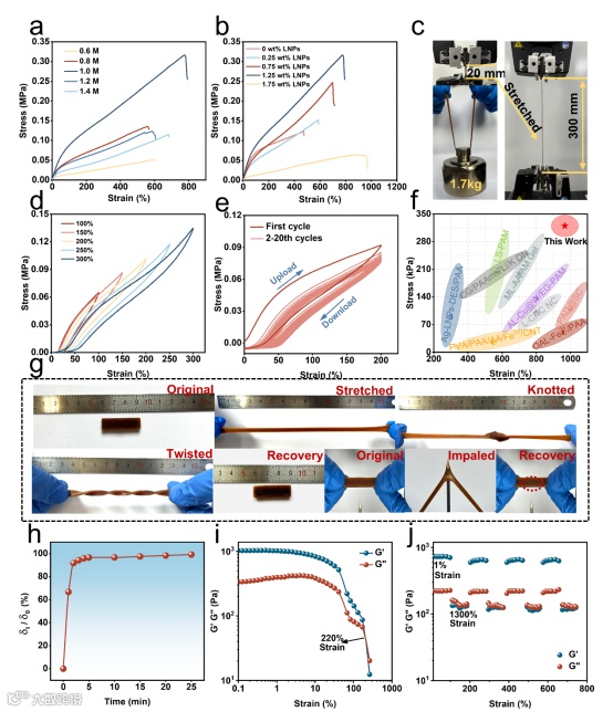 图3.1.25wt% LNPs-PDMAA的水凝胶电解质的力学性能与自愈合特性测试。(a) 不同碱浓度水凝胶电解质的应力-应变曲线。(b) 不同LNPs含量水凝胶电解质的应力-应变曲线。(c) LNPs-PDMAA-1.25wt%水凝胶电解质在拉伸及重物压迫下的实景照片。(d) 不同应变下的拉伸循环测试。(e) 20次200%应变拉伸循环。(f) LNPs-PDMAA与其他已报道水凝胶电解质的力学性能对比。(g) 经不同变形及自愈合处理的水凝胶电解质照片。(h) 经400%变形后水凝胶电解质的自恢复曲线。(i) 在固定角频率10 rad s⁻¹下,通过1%-1000%应变幅值扫描测得水凝胶G'与G“值。(j) 在固定角频率10 rad s⁻¹及1300%大应变条件下,180秒循环加载过程中的G'与G”变化曲线。