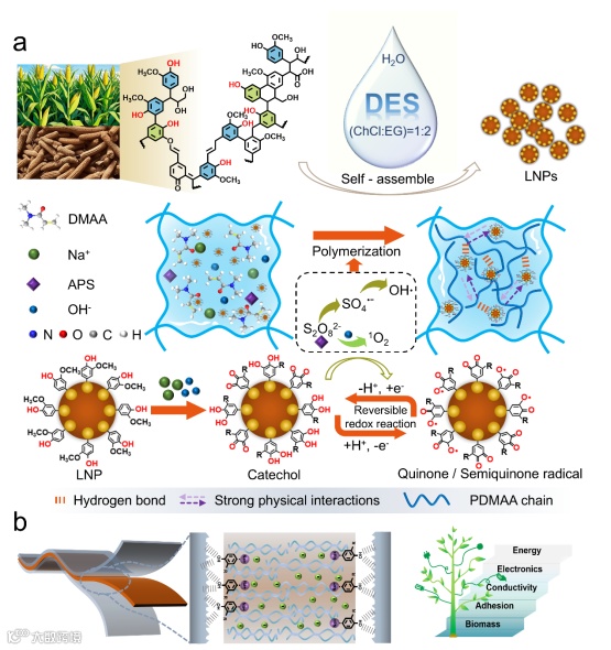 图1. LNPs-PDMAA水凝胶电解质快速水凝胶化的示意图。(a) 木质素纳米颗粒的自组装过程,以及在碱性环境中APS引发的SO₄•⁻、OH•和1O₂自由基生成,进而诱导DMAA单体聚合。(b) LNPs-PDMAA水凝胶电解质内部聚合物链分布及其与基底材料的附着情况。