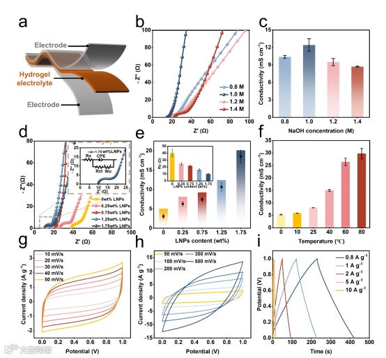 图5. 基于LNPs-PDMAA水凝胶电解质组装的超级电容器的电化学性能。(a)超级电容器的“三明治”结构示意图。(b) (c) 不同NaOH浓度超级电容器的电化学阻抗谱与离子电导率曲线。(d) (e) 不同LNPs含量的超级电容器EIS谱与离子电导率曲线。(f) 基于1.25wt% LNPs-PDMAA的超级电容器在不同温度下的离子电导率。(g) (h) 基于LNPs-PDMAA-1.25wt%的超级电容器在10至500 mV/s扫描速率下的循环伏安曲线。(i) 基于LNPs-PDMAA-1.25wt%的超级电容器在0.8至10 A g⁻¹电流密度下的恒电流放电曲线。