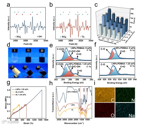 图2. 快速凝胶化形成的影响因素与机制。(a) (b) EPR测试表征SO₄•⁻、OH•和1O₂自由基。(c) LNPs含量与NaOH浓度对水凝胶化时间的影响。(d) LNPs介导水凝胶形成调控演示:含0 wt%、1.25 wt%及2.5 wt% LNPs的聚合反应。(e) (f). 采用高分辨率XPS分析LNPs-PDMAA-0 wt%和LNPs-PDMAA-1.25 wt%水凝胶电解质中的C 1s和O 1s区域。(g) 添加0 wt% AL、1.25 wt% AL及1.25 wt% LNPs对水凝胶力学性能的影响。(h) AL、LNPs及LNPs-PDMAA的FT-IR光谱。(i) LNPs-PDMAA水凝胶电解质中C、N、O和Na元素的EDS谱图。