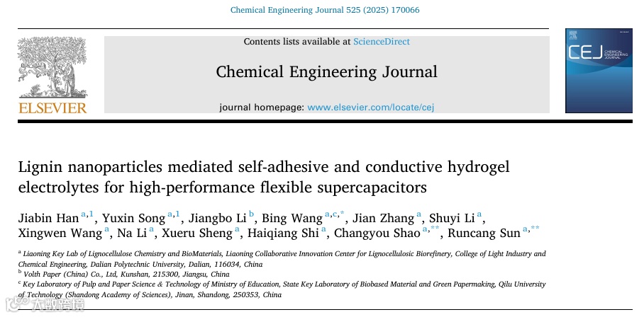 近日,来自大连工业大学杰出青年、长江学者孙润仓教授,王兵、邵长优副教授,在国际知名期刊Chemical Engineering Journal上发表题为“Lignin nanoparticles mediated self-adhesive and conductive hydrogel electrolytes for high-performance flexible supercapacitors”的研究文章。该文章开发了一种由LNPs调控的协同自催化水凝胶电解质制备方法。凝胶化过程无需依赖紫外线或高温等传统引发聚合,而是在室温下直接引发乙烯基单体聚合。通过简单环保的自组装工艺制备的LNPs,不仅具有更小的粒径和更大的比表面积,还能有效保留木质素分子固有的活性官能团,使其具有更好的自由基清除能力,从而实现凝胶化的有效调控。基于LNPs-PDMAA的水凝胶电解质兼具高抗拉强度与断裂伸长率。所制备的柔性超级电容器无需额外粘合剂,有效降低了界面电阻并增强了离子传输性能。该超级电容器在0.8 A g⁻1条件下展现出高比电容、高能量密度和功率密度。所开发的水凝胶电解质在柔性储能领域具有显著潜力,实现了生物质向能源的转化。