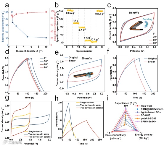 图6. 基于LNPs-PDMAA-1.25wt%的超级电容器的电化学性能。(a) 在0.8-10A g⁻¹不同电流密度下,基于LNPs-PDMAA-1.25wt%的超级电容器的比电容和库仑效率。(b) 不同电流密度(0.8-10 A g⁻¹)下超级电容器循环过程中的比电容变化。(c) (d) 不同弯曲角度(0-90°)下超级电容器的CV与GCD曲线。(e) (f) 剪切自愈后超级电容器的CV曲线与GCD曲线。(g) (h) 串联与并联连接的两款LNPs-PDMAA-1.25wt%超级电容器的CV曲线与GCD曲线。(i) 比电容、能量密度及离子电导率与其他文献数据对比。