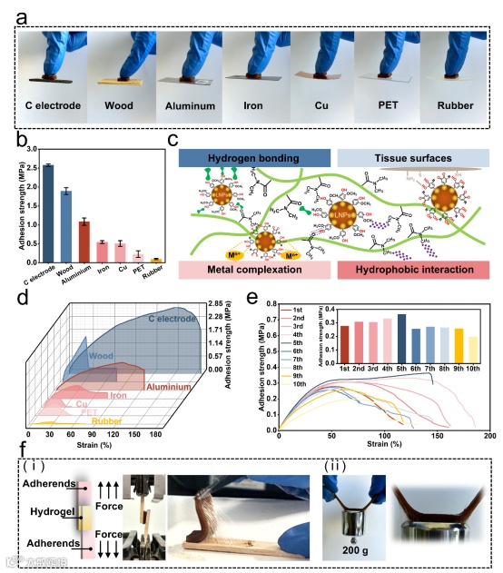图4. LNPs-PDMAA-1.25wt%水凝胶电解质粘附性能测试。(a) 水凝胶电解质对不同性质材料的粘附效果。(b) 对不同材料的粘附强度。(c) 对不同材料的粘附机制。(d) 对不同材料粘附的应力-应变曲线。(e) 木块表面10次粘附循环过程中的粘附强度与应力-应变曲线。 (f) 水凝胶电解质在拉伸测试、90°剥离测试中粘附木块及承重测试的照片。