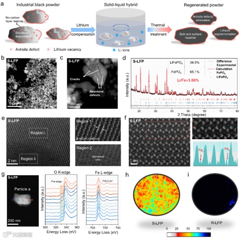 随着电动汽车与储能系统快速发展,电极材料LiFePO4(LFP)因其优异的结构稳定性、热安全性和成本优势被广泛应用。然而,长时间深度充放电过程中,LFP不可避免地发生退化,包括晶格畸变、锂耗竭以及Fe/Li反位缺陷等,并呈现出颗粒间及颗粒内结构明显的差异。针对退役LiFePO4(S-LFP),传统火法与湿法工艺不仅使再生LiFePO4(R-LFP)难以恢复原有性能,而且能耗高、污染重。相比之下,保留晶格并修复缺陷的直接再生路径被认为更具可持续性。然而,以往报道的再生策略(如熔盐补锂、有机锂螯合等)多以“均一退化假设”为前提,无法对不同退化区域的异相结构进行精准修复,普遍存在过度补锂、体相修复不足等局限。