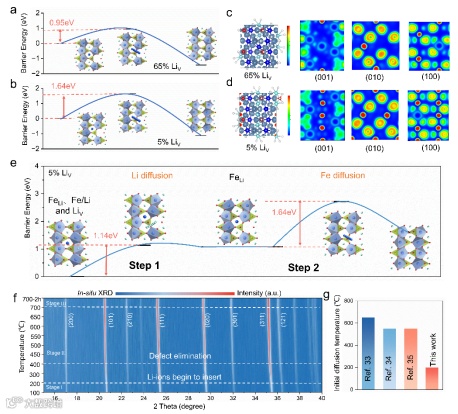 图3.(a)和(b)不同 Li 空位浓度(65% LiV 与 5% LiV)下Fe/Li反位缺陷重新排布的能量曲线及示意图;(c)和(d)65% 和5% LiV浓度下的电子局域函数(ELF)分布;(e)Li/Fe 反位缺陷重排过程的能量曲线及结构示意;(f)原位变温XRD 演化结果及等高线图;(g)Li+扩散起始温度对比。
