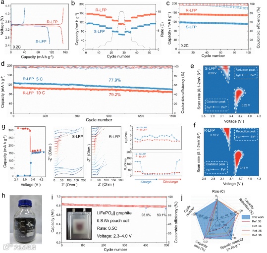 图4.(a)0.2 C下首次充放电曲线;(b)S-LFP与R-LFP倍率性能对比;(c)0.2 C下的循环性能;(d)R-LFP在5 C与10 C下的循环测试;(e)与(f)分别为S-LFP和R-LFP在不同扫描速率下的CV曲线等高线;(g)原位EIS 测试的电压曲线以及充放电过程中S-LFP和R-LFP电池的EIS谱图;(h)R-LFP实物照片;(i)以R-LFP为正极0.8 Ah 软包电池循环稳定性测试;(j)本工作与文献报道倍率、比容量、容量衰减率及最大循环次数的对比。