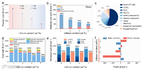 图5.(a)不同锂含量废弃磷酸铁锂的原料成本;(b)直接再生工艺的总材料成本;(c)湿法再生工艺的总成本;不同锂含量湿法再生与直接再生(d)总成本对比;(e)总收益对比;(f)利润对比。