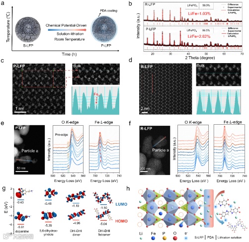 图2.(a)室温补锂(P-LFP)自发补锂过程的示意图;(b)P-LFP与R-LFP的XRD图谱;(c)沿 [010] 方向拍摄的P-LFP的HAADF图及红框选区滤波后的强度线截面图;(d)沿[010]方向拍摄的R-LFP的HAADF图及红框选区滤波后的强度线截面图;(e)P-LFP颗粒a的STEM图像及对应的EELS能量损失谱;(f)R-LFP颗粒a的STEM图像及对应的EELS能量损失谱;(g)DA单体、DHI 单体、DHI-DHI 二聚体及DHI-DHI四聚体的HOMO-LUMO轨道对比;(h)自发补锂过程的示意图。