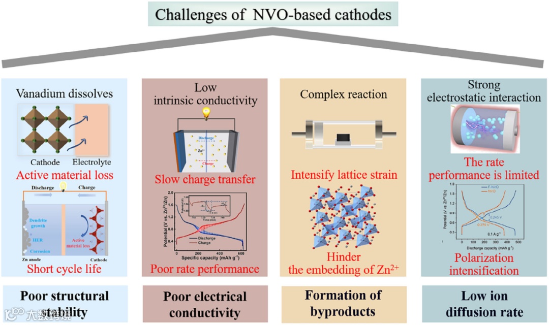 图2. NVO基AZIBs正极的挑战。
