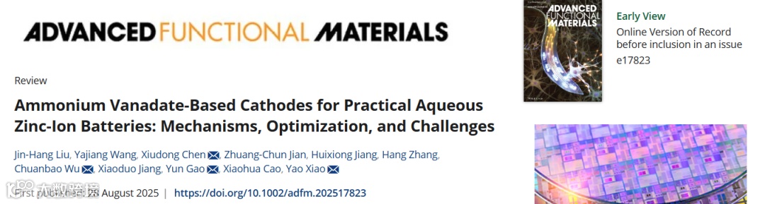 近日,来自九江学院的陈修栋教授团队在国际知名期刊Advanced Functional Materials上发表题为“Ammonium Vanadate-Based Cathodes for Practical Aqueous Zinc-Ion Batteries: Mechanisms, Optimization, and Challenges”的综述文章。该综述系统总结了钒酸铵(NVO)基水系锌离子电池(AZIBs)正极材料的结构特征与储锌机理,分析了其实际应用中的关键挑战及对应的改性策略。首先介绍了NVO独特的优势。随后,系统综述了NVO基正极现存的问题,并详细阐述了改性策略的作用机制与效果,还展望了多策略协同优化、适配电解液开发及先进表征技术应用的未来方向。该综述为AZIBs领域高性能NVO基正极材料的研发及AZIBs产业化推进提供了重要理论参考与科学指导。