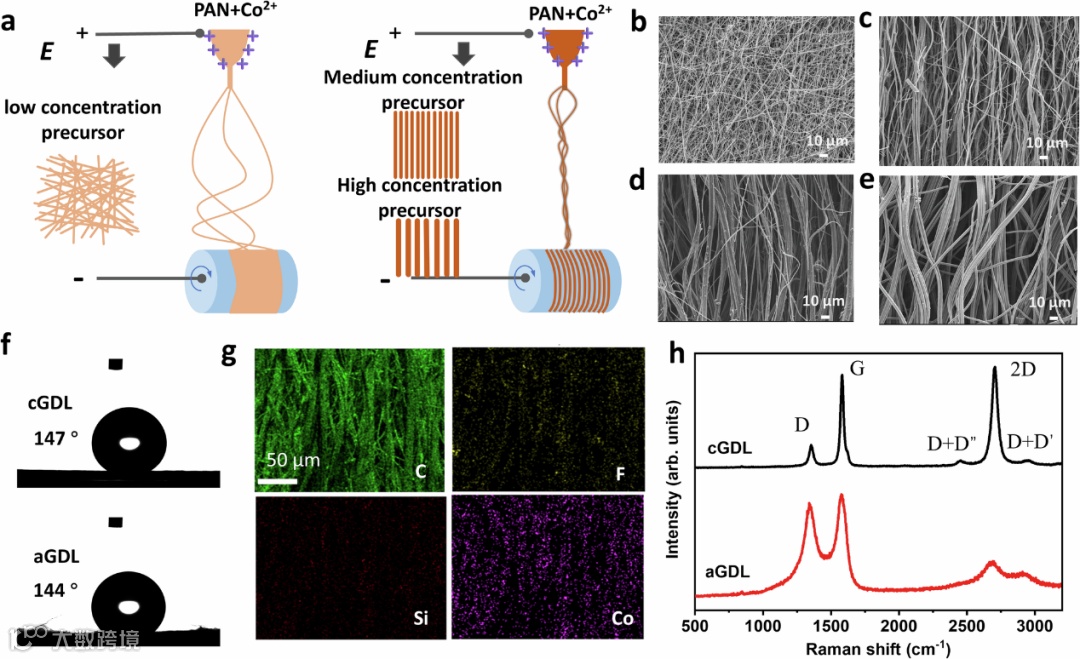 本研究通过调节PAN前驱体溶液浓度与静电纺丝条件,制备出纤维直径可控的有序定向气体扩散层。加入钴盐促进了纤维排列与石墨化,热处理后纤维直径随PAN浓度增加而增大。经疏水处理后接触角提高至144°,与商业GDL(147°)相近。拉曼光谱表明制备的GDL石墨化程度略低于商业产品,但CT扫描显示其具有更好的纤维排列和更大的孔径分布范围,有望提升燃料电池性能。