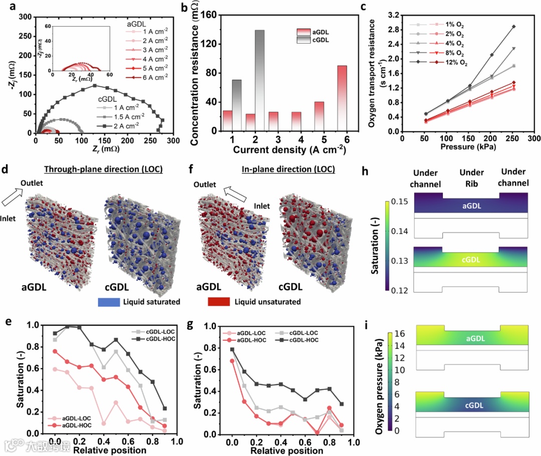 本研究采用电化学阻抗谱(EIS)、极限电流实验、孔隙尺度模拟和有限元模拟方法分析了质子交换膜燃料电池中含定向气体扩散层(aGDL)与商业气体扩散层(cGDL)的水气传输性能。通过等效电路模型拟合EIS测试数据发现,cGDL在电流密度超过2 A cm⁻²时严重积水导致显著的浓差极化损失,而aGDL在高达5 A cm⁻²条件下表现稳定,仅在6 A cm⁻²时略有增加。通过极限电流密度法测得的氧气传输阻力(OTR)表明,aGDL在不同氧气浓度和背压条件下均表现出明显较低的OTR,且随压力呈线性关系,表明其抗积水性能优异。孔尺度模拟显示,aGDL中液态水饱和度显著低于cGDL,无论是在横向还是纵向方向均呈现更优的排水性能。电池尺度的有限元模拟进一步证实,aGDL显著降低了液态水饱和度并提高了氧气压力分布,从而改善电池性能。