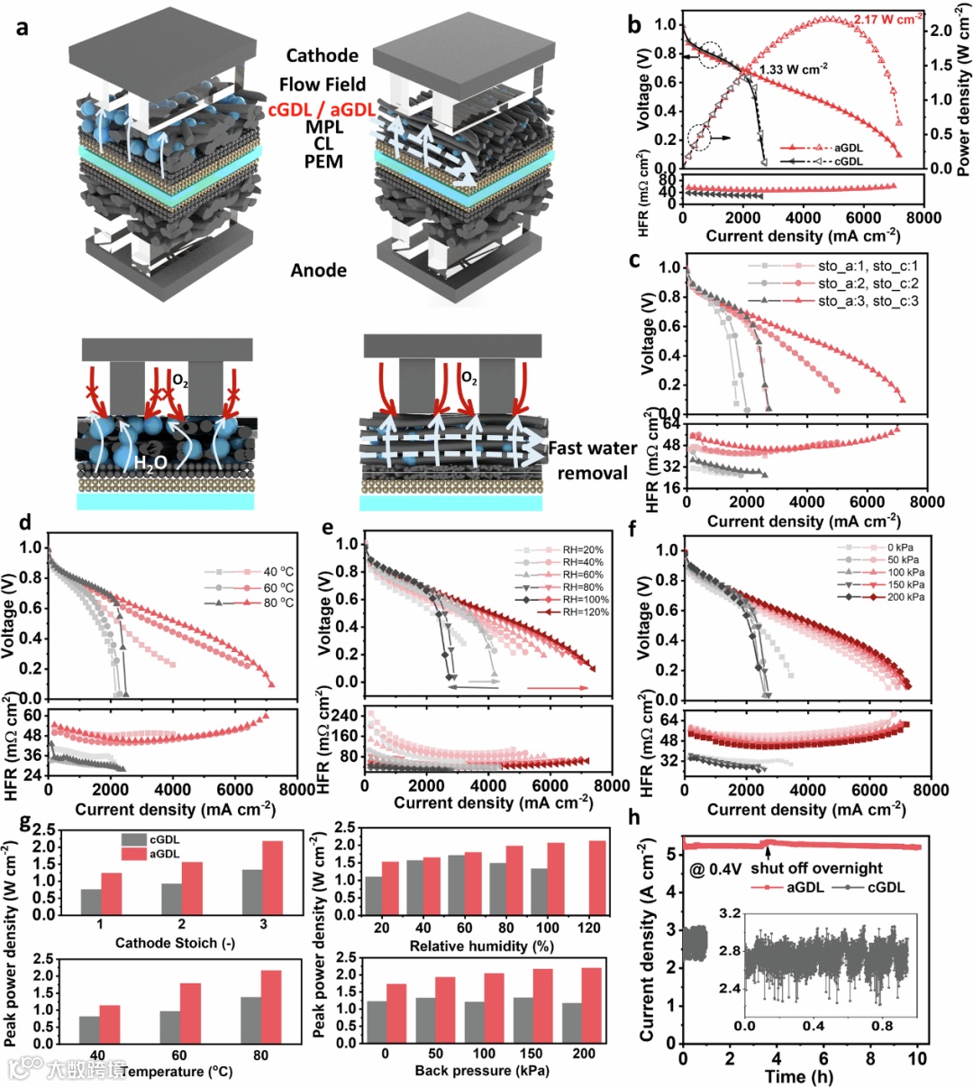 研究通过对比自制的定向aGDL和商业随机cGDL在质子交换膜燃料电池中的表现,评估aGDL的实际应用潜力。在标准条件下,aGDL电池的极限电流密度和峰值功率密度分别达到了7200 mA cm⁻²和2.17 W cm⁻²,分别为cGDL电池的2.7倍和1.6倍。此外,在低气体流速、低温、高湿度、高背压等恶劣工况下,aGDL电池仍表现出更低的浓差极化损失和更高的稳定性。稳定性测试表明,aGDL电池可在0.4 V下稳定运行,电流密度稳定在5000 mA cm⁻²以上,而cGDL电池则出现明显波动。同时,加速腐蚀实验(AST)表明,aGDL具有优异的抗腐蚀性能,可重复利用,性能恢复良好。总体而言,aGDL在各种工况下均优于cGDL,具备较强的实际应用替代潜力。