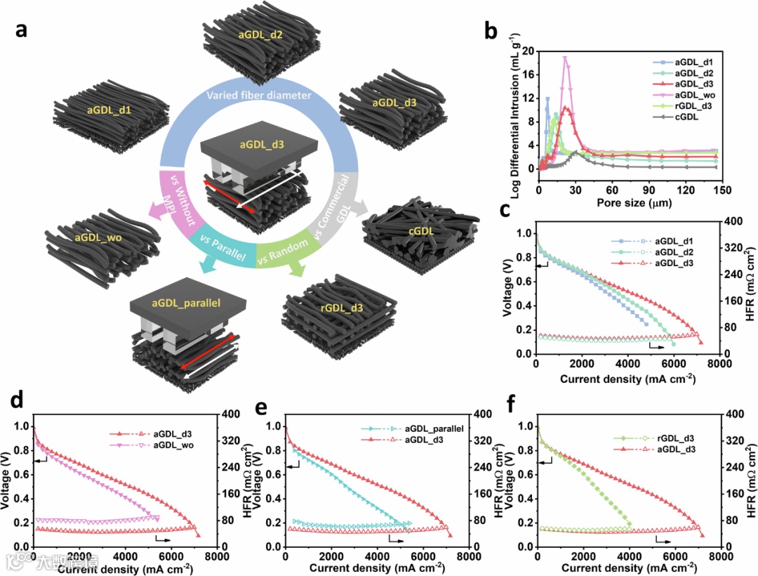 本研究系统分析了气体扩散层结构对质子交换膜燃料电池性能的影响。通过正交实验法,研究了纤维直径、微孔层(MPL)的有无、纤维排列方向以及随机化程度的效应。结果表明,随着GDL纤维直径增大,孔径增加,有利于改善高电流密度下的水排出性能,其中aGDL_d3的孔径最大,表现出最佳的质量传输性能。采用电纺纤维制备的MPL有效降低了接触电阻。将纤维垂直于流道放置时,性能优于平行于流道放置的结构,原因在于后者会增加电池的欧姆电阻和质量传输损失。此外,通过交错堆叠制备的随机排列纤维层相比于定向排列纤维层孔径减小,导致水管理性能降低。因此,采用较大直径纤维的有序结构,并垂直于流道方向放置,有效提升了PEMFC的性能。