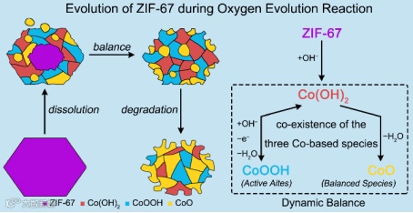 ZIF-67在碱性介质OER中的演化过程示意图。