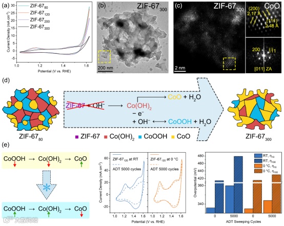ZIF-67在长期OER中的失活。(a)扫描80圈后持续的CV分析。(b)ZIF-67300的TEM和(c)HAADF-STEM图像。(d)ZIF-6780失活示意图。(e)通过相平衡调控增强稳定性:室温与0 °C下ZIF-67120在额外5000次ADT循环前后的CV和LSV过电位变化对比。