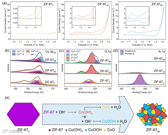 ZIF-67在OER过程中结构演变的光谱表征。(a)不同循环阶段ZIF-67的CV曲线。(b–d)不同循环阶段ZIF-67的(b)N 1s、(c)Co 2p和(d)O 1s的XPS谱图。(e)OER反应中ZIF-67从初始态到平衡态演变过程的示意图。