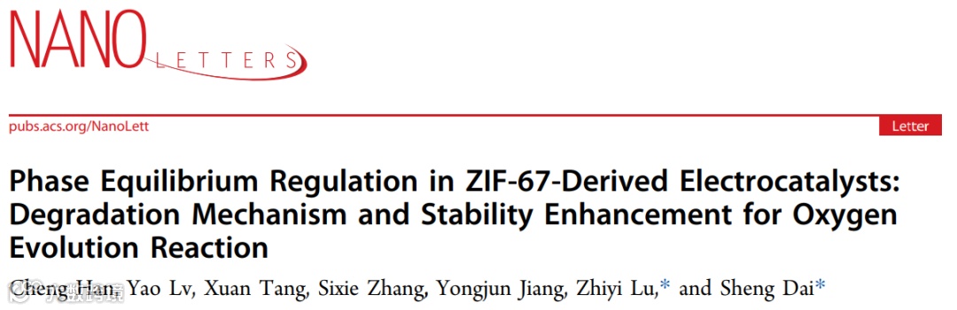 近日,来自华东理工大学的戴升教授与中科院宁波材料的陆之毅研究员合作,在国际知名期刊Nano Letters上发表题为“Phase Equilibrium Regulation in ZIF-67-Derived Electrocatalysts: Degradation Mechanism and Stability Enhancement for Oxygen Evolution Reaction”的文章。该文章针对MOF电催化剂性能和稳定性不佳的共性问题,选取经典Co基MOF材料ZIF-67,通过原子分辨同位电镜技术(IL-TEM)实时追踪其在碱性OER中的结构演变,揭示了其失效根源并提出了普适性的改善策略。